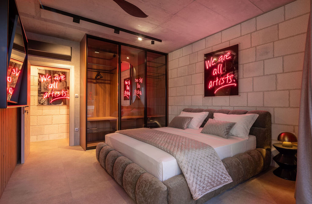 - Harmonische Kombination aus modernem und klassischem Design mit ausgewählten Gemälden und stimmungsvoller LED-Beleuchtung, Elegante Holz- und Steindetails