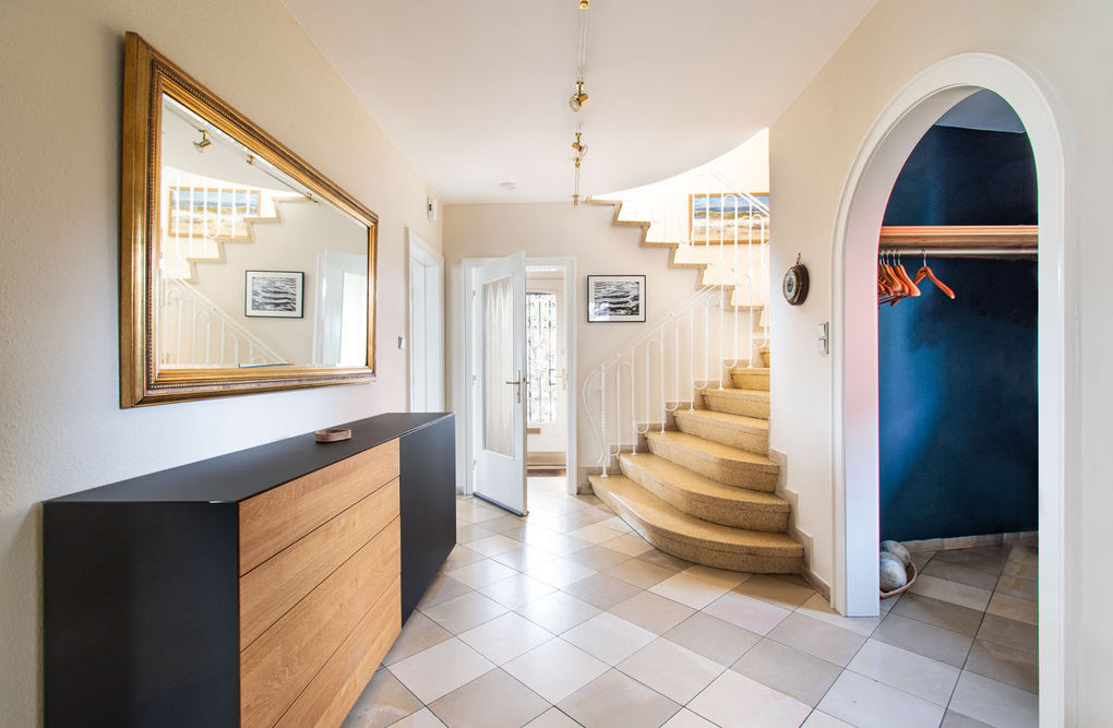 - Elegant geschwungene Treppe mit Steinbelag führt ins Obergeschoss