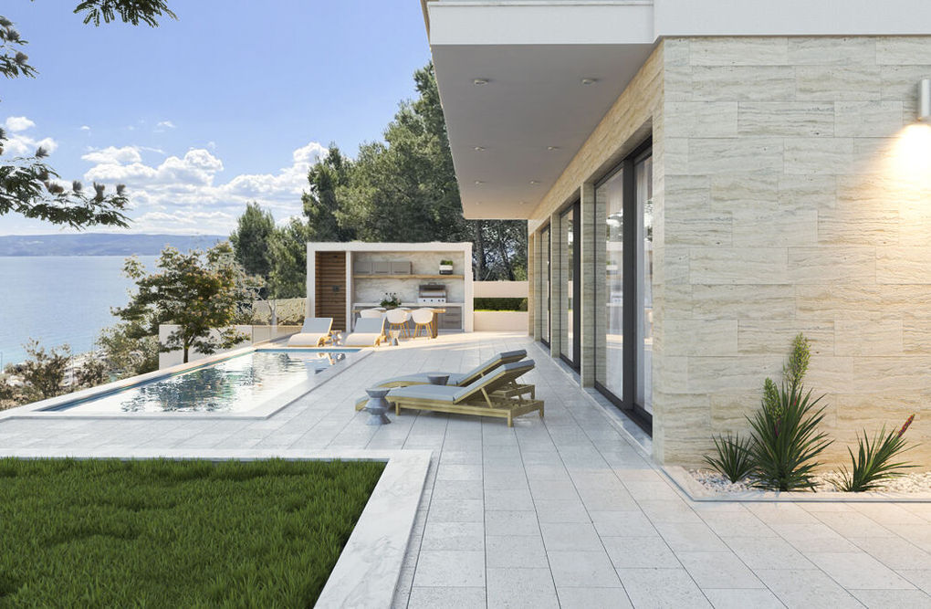 - Außenbereich: Pool mit Außendusche, großzügiger Terrassenbereich mit Sonnenliegen, Außenküche, Essbereich