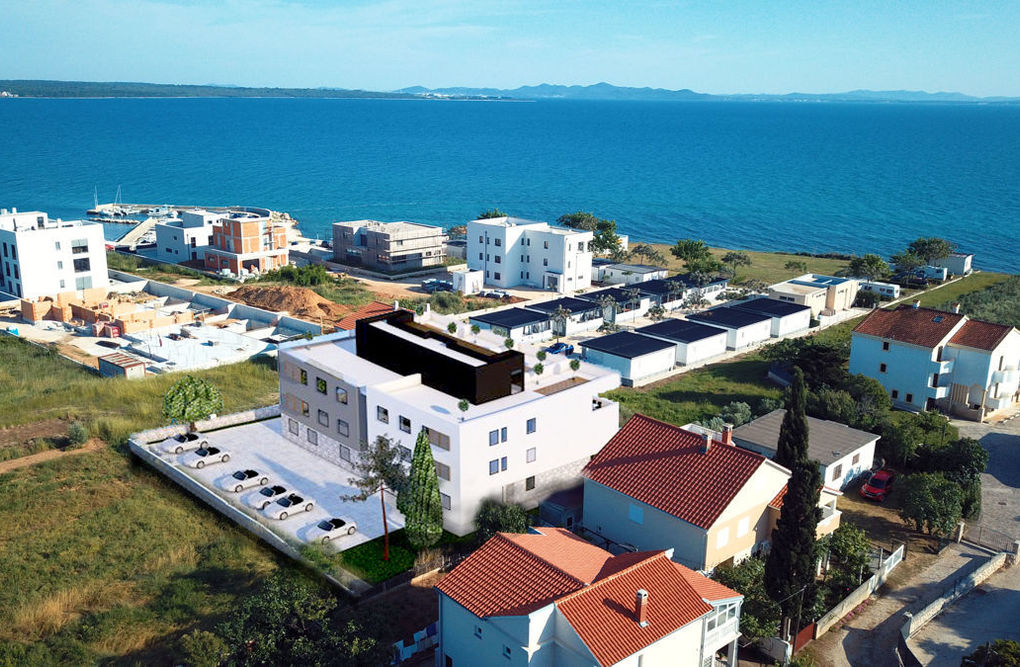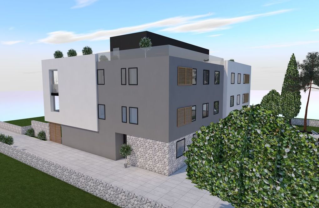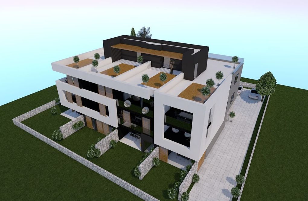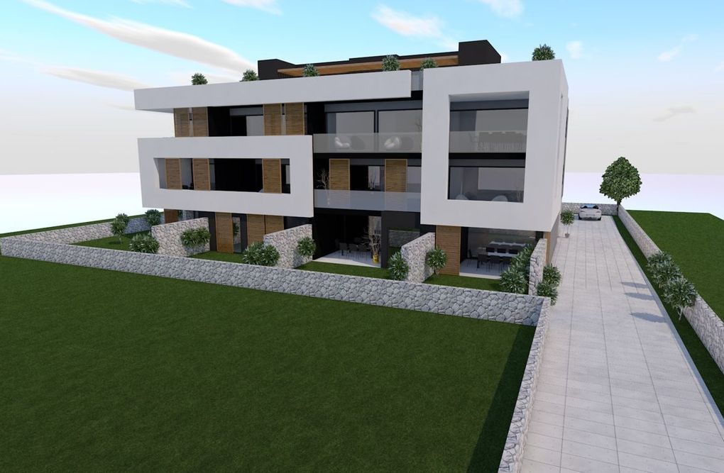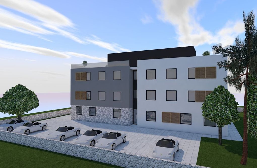- Wohnzimmer mit offener Küche, zwei Badezimmer, zwei Schlafzimmer, Loggia und Vorgarten