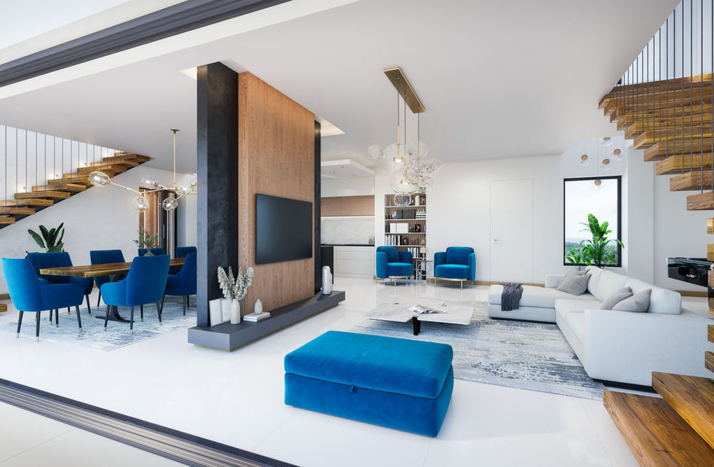 - Der weitläufige Wohnbereich überzeugt durch die offene Gestaltung und den direkten Übergang zum Esszimmer, zur Küche und zum Billardzimmer