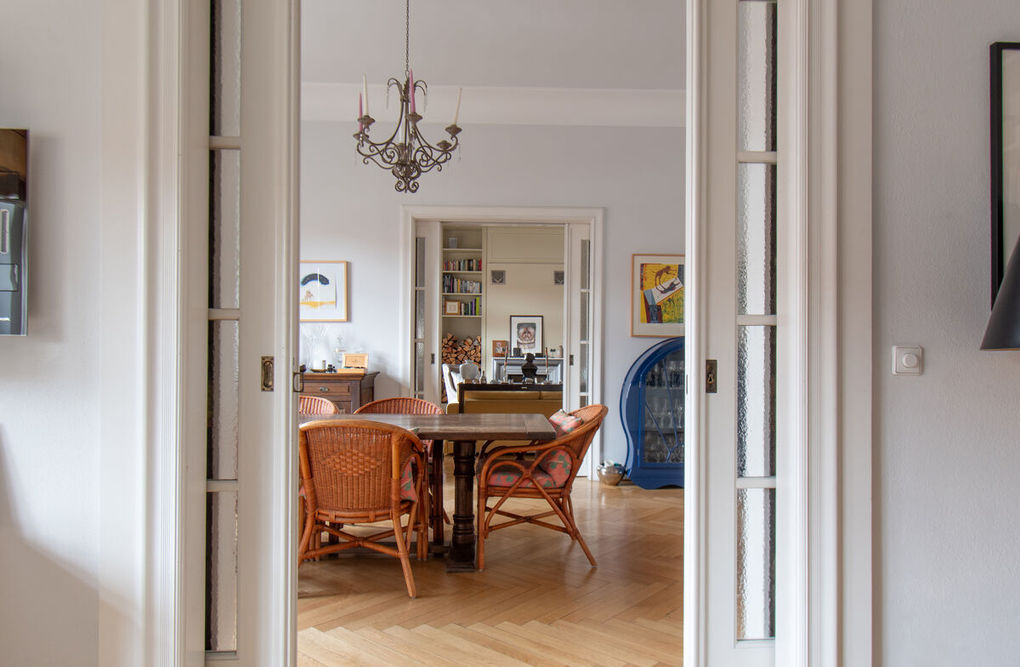 - Fischgrätparkett und klassische Dielenböden unterstreichen den Altbaucharakter