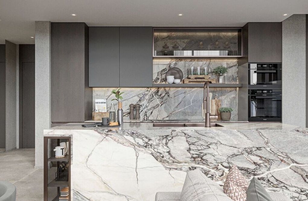 - Elegante Küchenzeile mit hochwertigen Oberflächen in moderner Marmoroptik